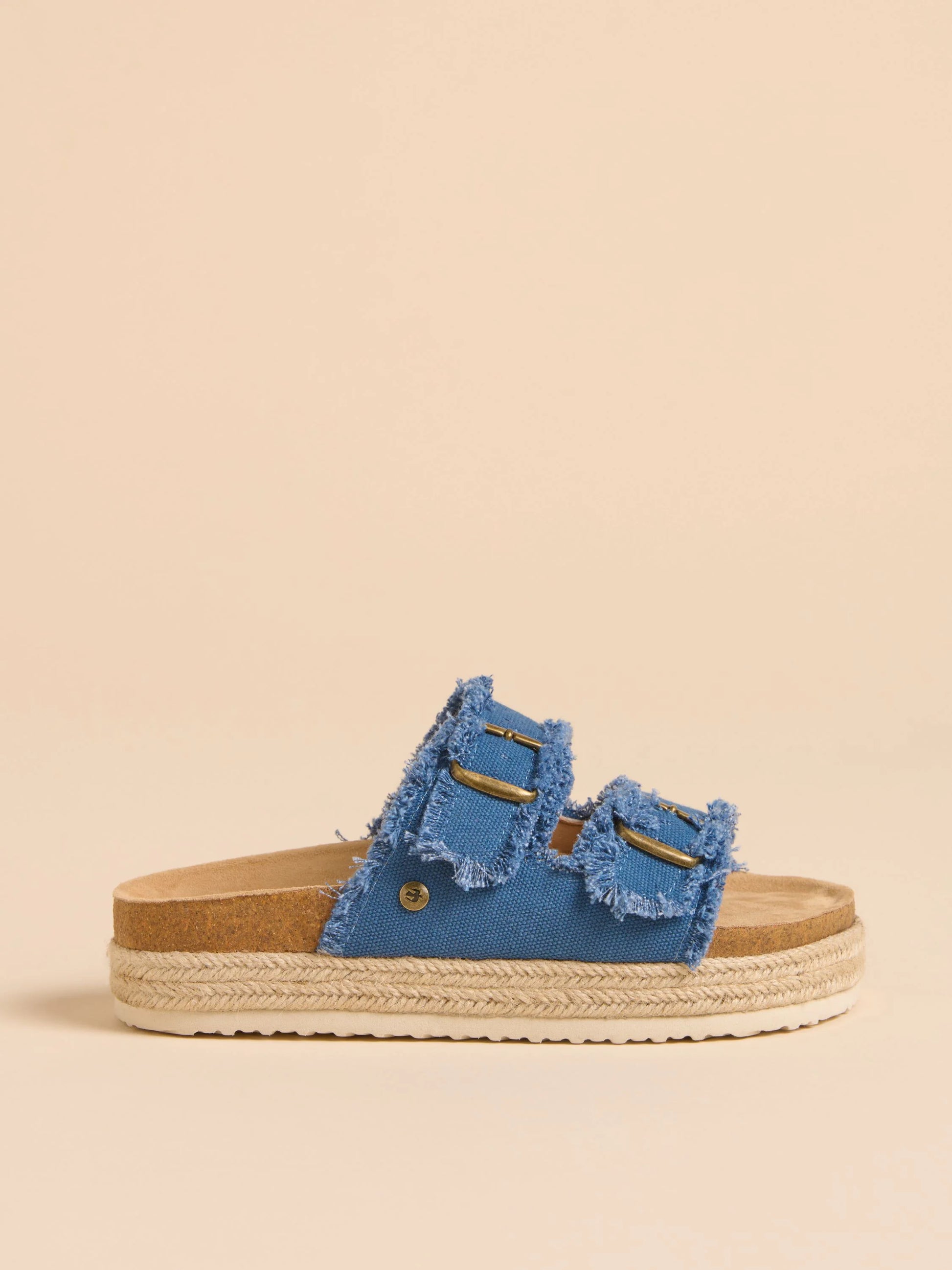 Discover the ideal blend of style and comfort with these retro chunky platform sandals featuring frayed denim straps and rope trim. They have wide adjustable straps and a supportive molded cork footbed with a soft faux-suede finish, making them perfect for all your summer outings.