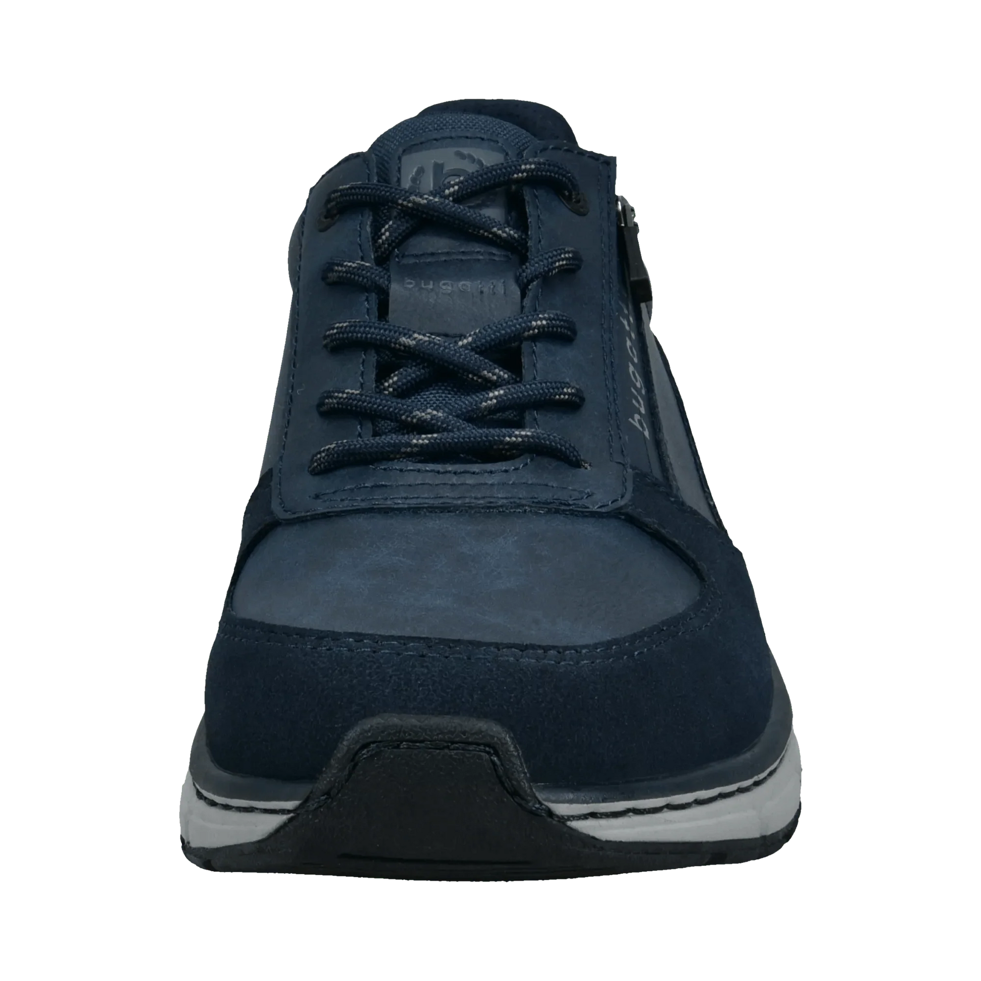Step up your casual game with these dark blue lace-up trainers from Bugatti. Featuring a striking cognac brown heel accent and signature logo zipper detail, they deliver contemporary style with everyday comfort. The padded construction and removable insoles provide cushioning where you need it most, while the extra-wide shoe tree ensures a perfect fit all day long. Ideal for laid-back looks that don't compromise on quality.