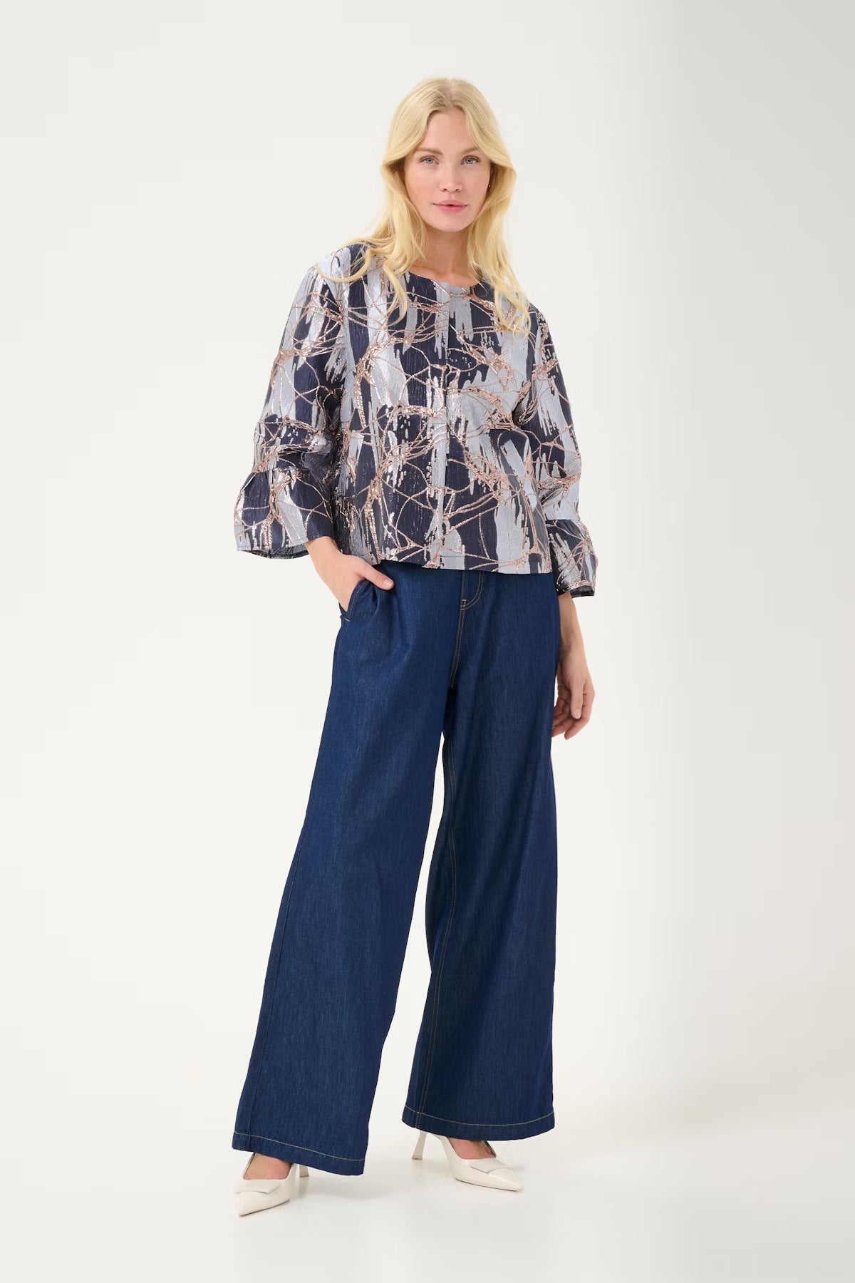 The Culture Banjo Jacket in blue combines bold style with everyday wearability. Its boxy cut and round neckline create a relaxed, modern silhouette, while flared 3/4 sleeves add movement and visual interest. The jacquard fabric features a textured, glossy finish that catches the light beautifully, giving this piece a polished edge perfect for dressing up casual outfits or layering over basics.