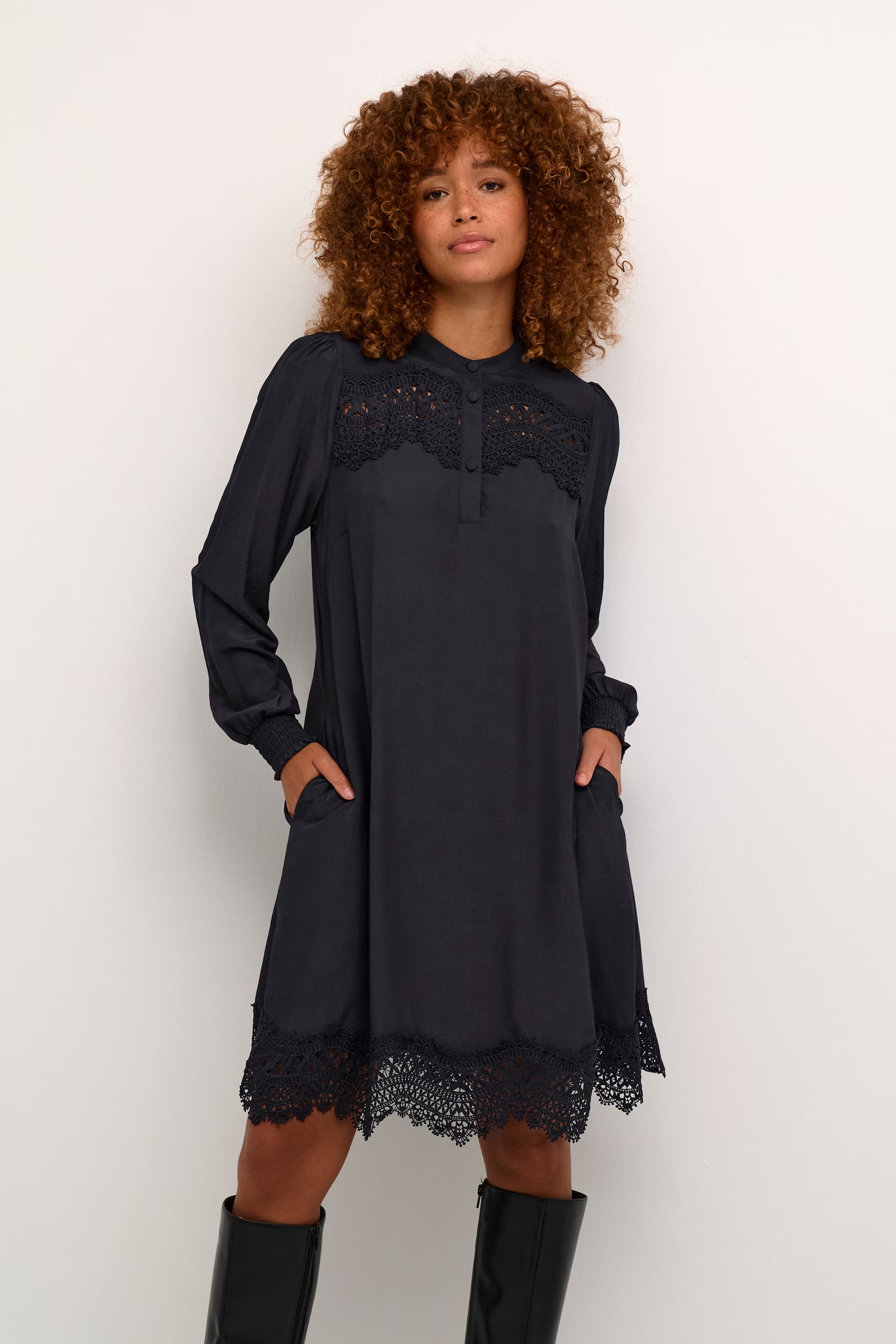The Culture Cutiffany Dress in Salute features an A-line fit with knee-length and long sleeves finished with elastic cuffs. Feminine lace details add a delicate touch, making it easy to style for everyday wear or special occasions.