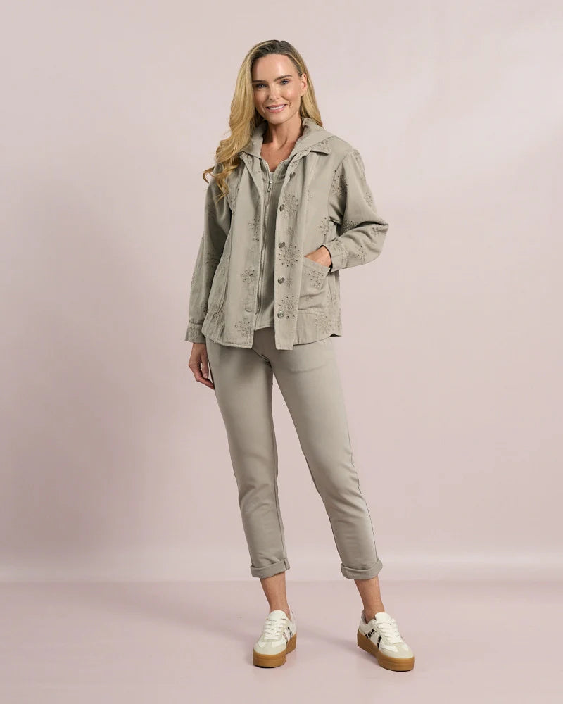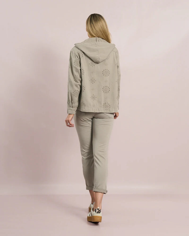 The Deck Hooded Jacket in beige is a casual, easy-to-wear jacket with a front zip for quick closure. Its hood adds extra warmth and comfort, making it perfect for everyday casual wear. The neutral beige color fits well with any outfit.