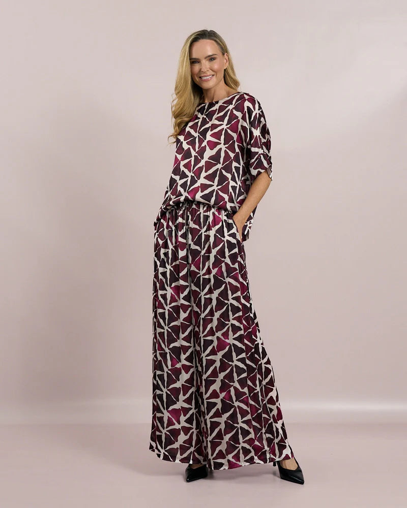 Elevate your wardrobe with the Deck Printed Top in Mulberry. Featuring a graceful boat neck and an elegant printed design, this top offers a refined silhouette perfect for both casual and dressier occasions. Crafted for comfort and style, it effortlessly enhances your look with timeless sophistication.