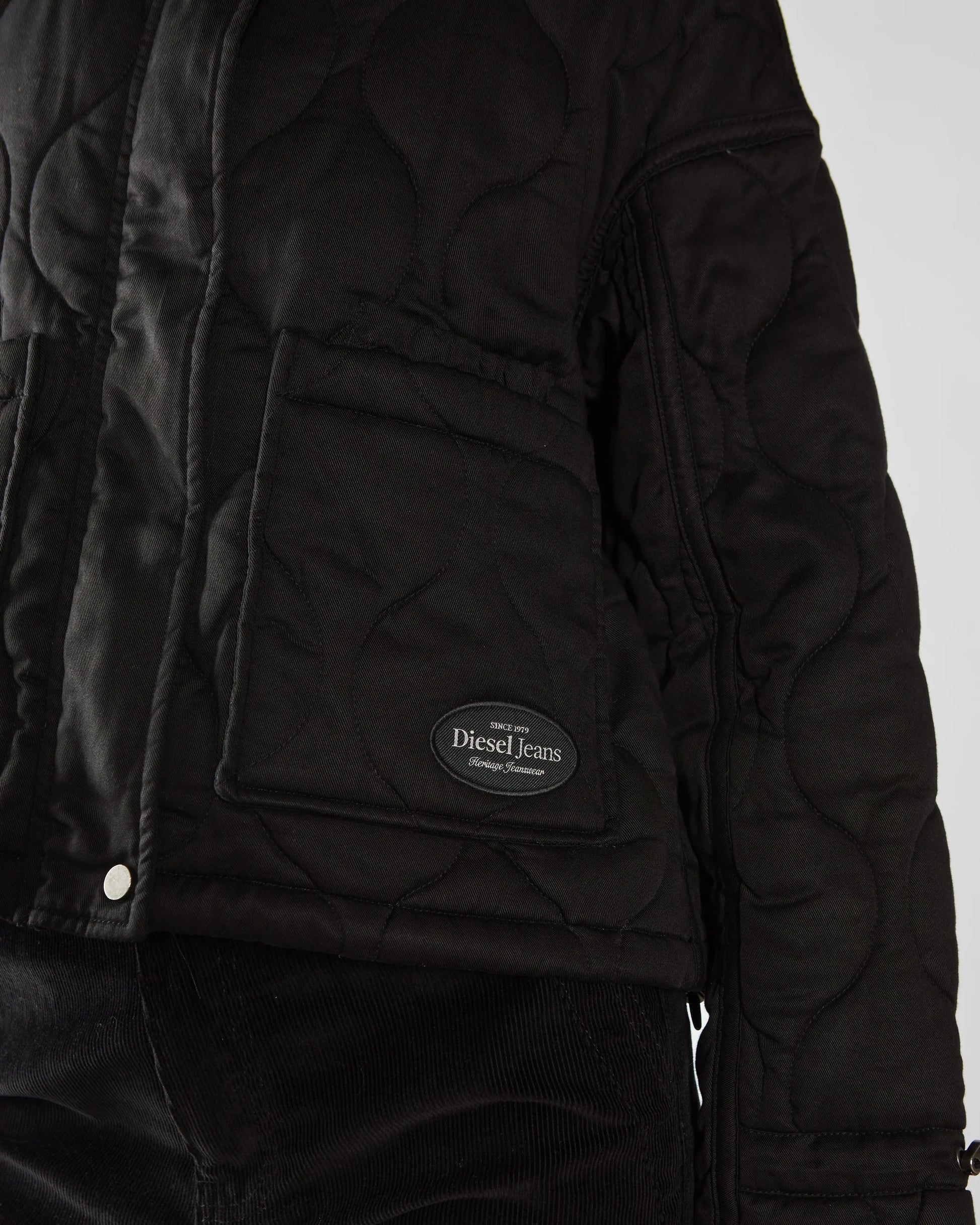 The Diesel Binkie Jacket in black offers a relaxed fit with quilted patch pockets and internal elasticated compartments for practicality. It features a front zip and metal snap buttons for secure closure, along with a woven branded DIESEL badge on the front pocket for a branded touch.