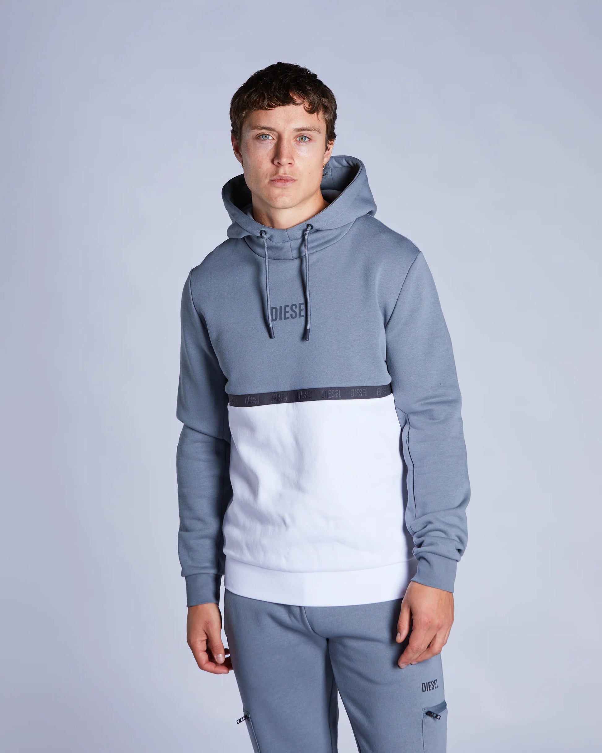 The Diesel Blaise Hoodie in Stormy Cloud features a soft brushed fleece interior for extra warmth and comfort. It has bold Diesel branding on the chest and branded tape detailing. The cozy hood and concealed sleeve pocket add practical style, while ribbed cuffs and hem provide a snug fit. With contrast paneling on the front and back, this hoodie combines comfort with a modern look.