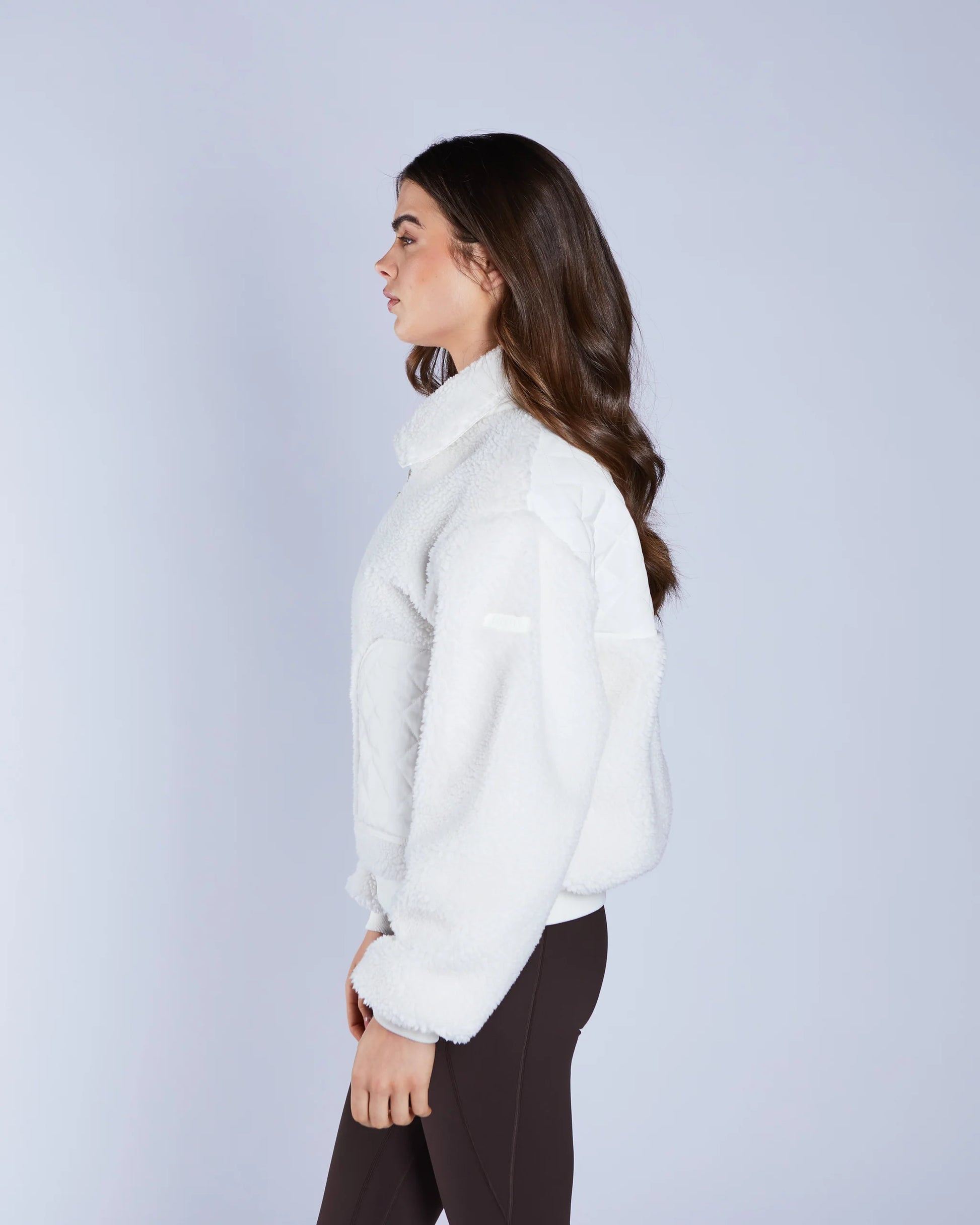 Relaxed fit borg jacket crafted from super soft fabric. Features quilted pockets and collar, a rubber artwork badge, and branded zip pocket detail. Perfect for effortless layering and everyday comfort.