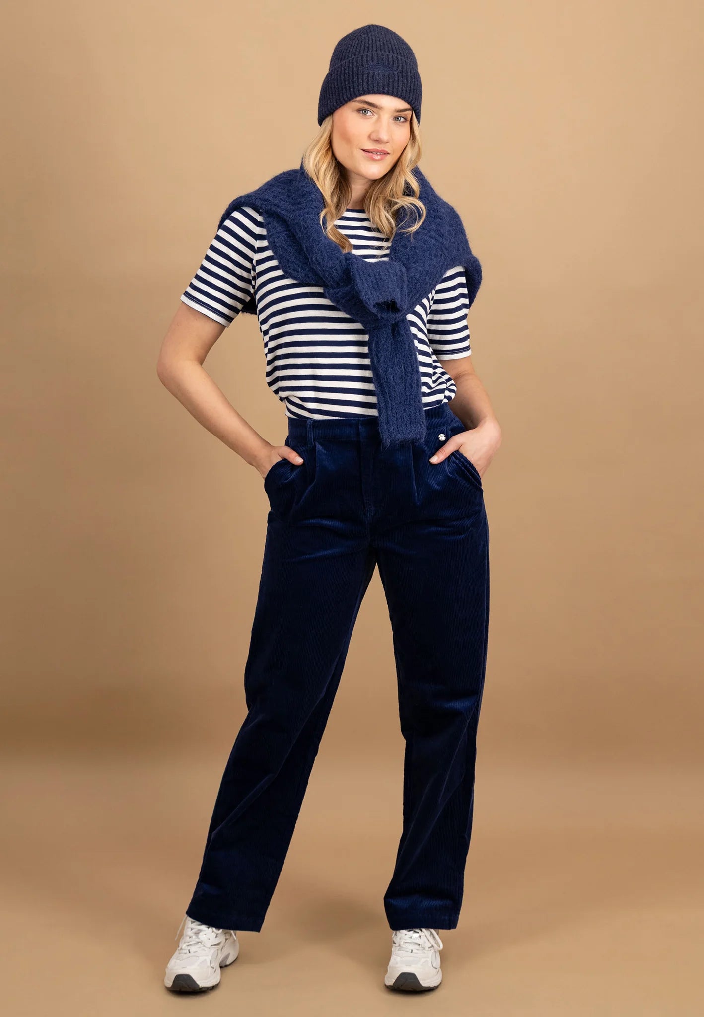 These Fynch Hatton Straight Leg Cords in Aura Blue are made from soft corduroy fabric that combines a retro look with modern style. Crafted from 100% polyester, they offer a comfortable feel and easy care. The pleated design adds elegance while allowing freedom of movement. With a straight, wide-leg cut, these trousers are perfect for casual yet polished fall and winter outfits.