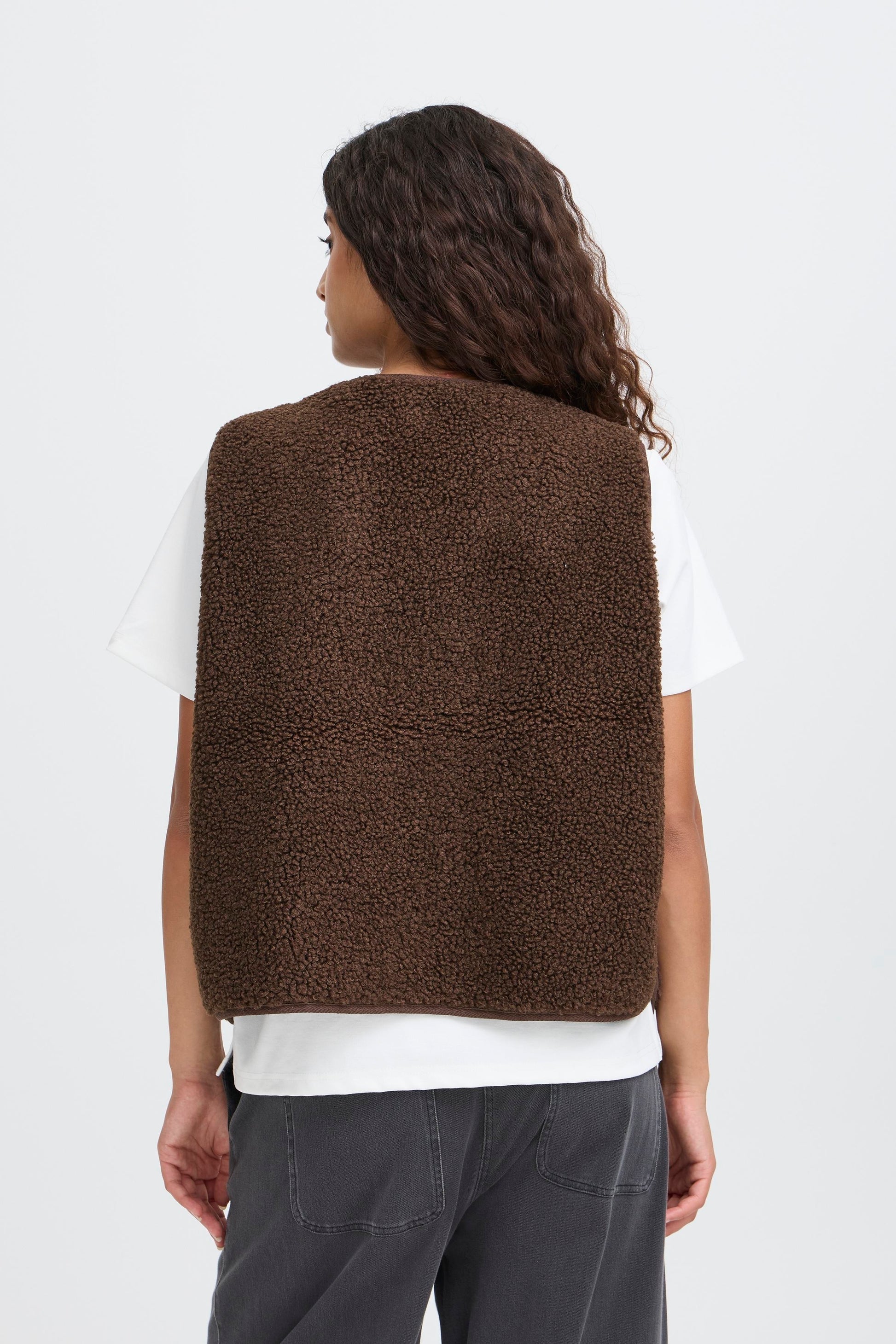Stay warm and stylish with the ICHI Gozima Waistcoat in Coffee Bean. This reversible teddy gilet offers versatile wear, allowing you to change up your look effortlessly while enjoying cozy comfort. Its soft, plush texture provides warmth without bulk, making it the perfect layering piece for cooler days. Elevate your outfit with a practical yet fashionable choice that adapts to your style.