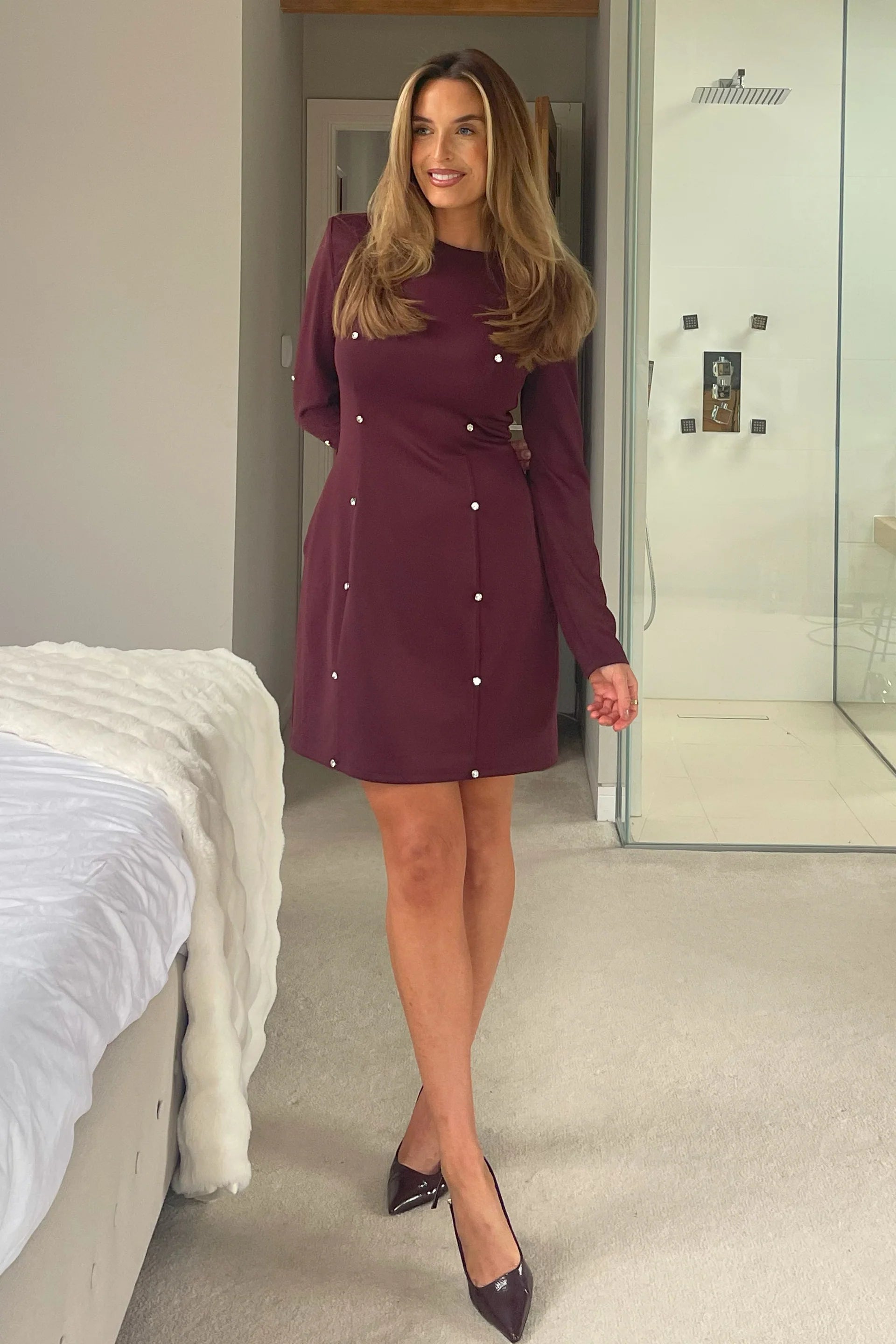The Girl In Mind Morrigan Studded Long Sleeve Mini Dress in Plum combines a classic silhouette with subtle studded accents for a refined look. Its long sleeves and mini length create a balance of elegance and playful style, perfect for a variety of occasions. This dress offers comfortable wear while adding a touch of charm to your outfit.