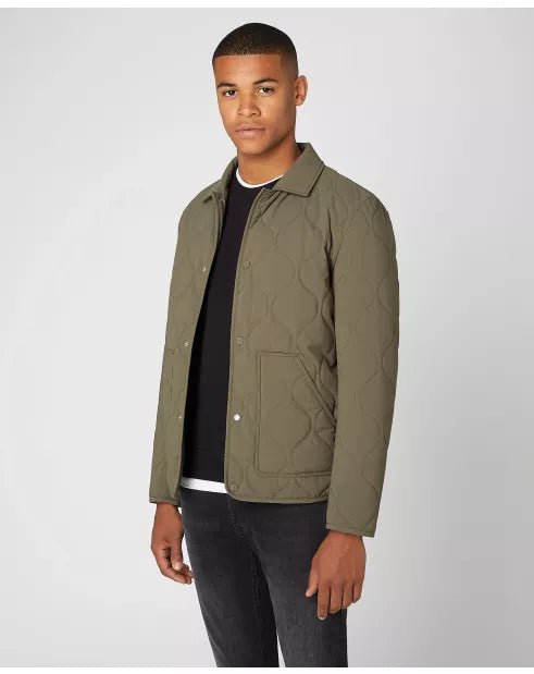 Lightweight quilted overshirt in khaki green with a relaxed shirt collar and metal snap buttons. Features practical side entry patch pockets for everyday convenience. Perfect for layering in transitional weather.