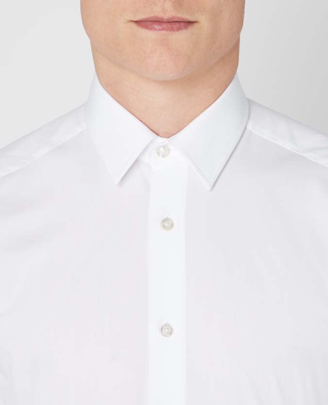 This Remus Uomo Ashton Slim Fit Shirt is expertly crafted from a high-quality, cotton-blend fabric for a sleek and comfortable fit. The slim fit design, french front, and narrow pointed collar add a touch of sophistication to your look, making this white long-sleeve shirt a must-have for any wardrobe.