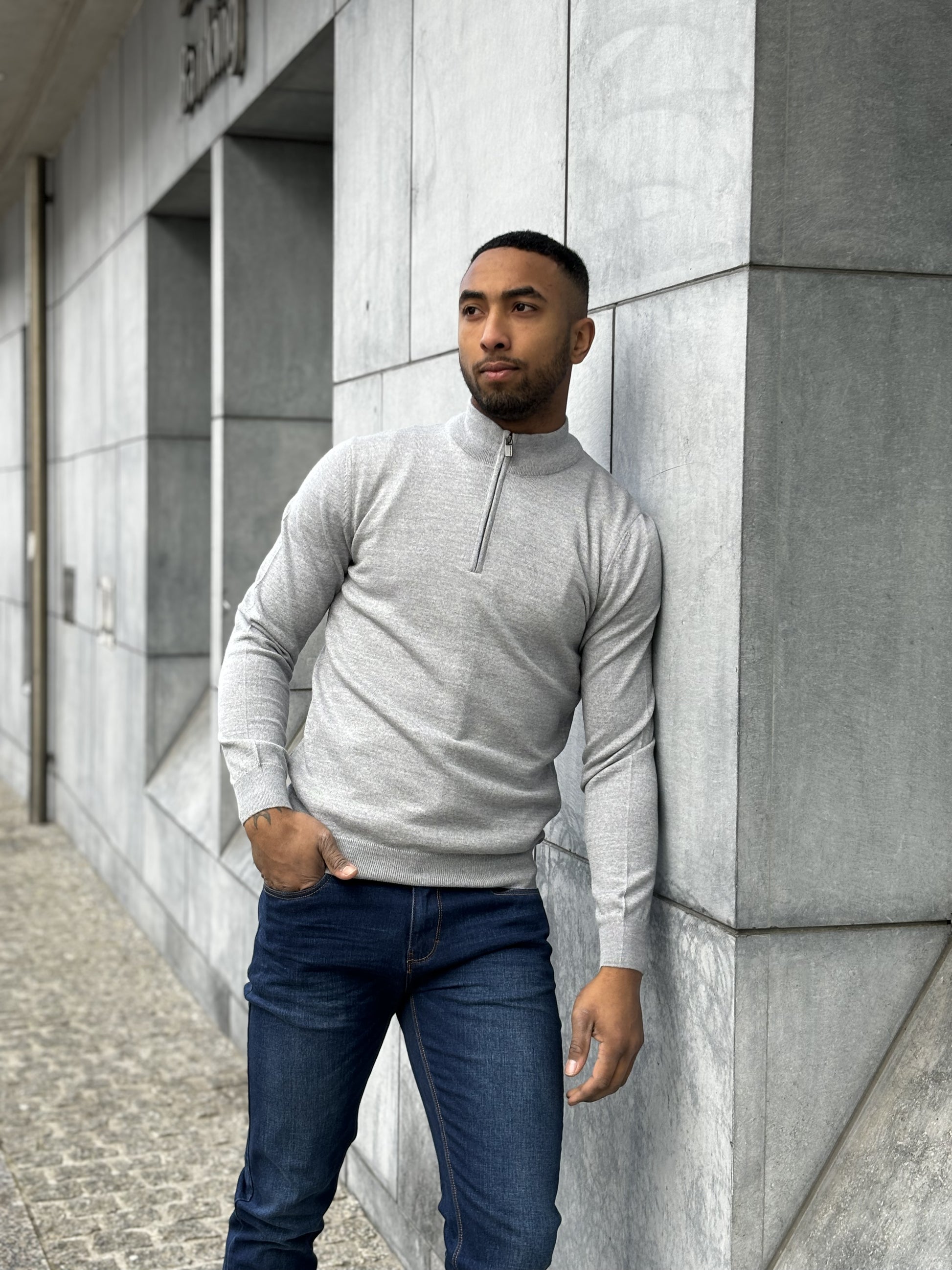 Stay warm and stylish with the Remus Uomo Half Zip Sweater. Its grey tapered fit and wool-blend fabric provide both comfort and a sleek look. The ribbed cuff and hem add an extra touch of sophistication to this long-sleeve sweater. Perfect for any occasion.