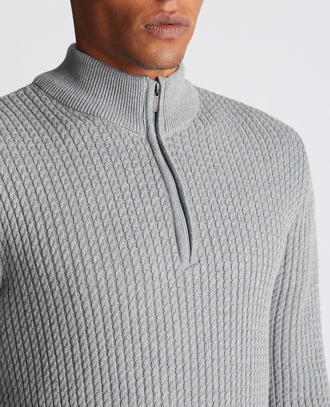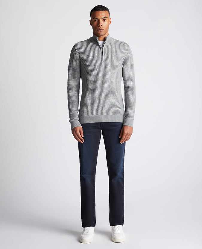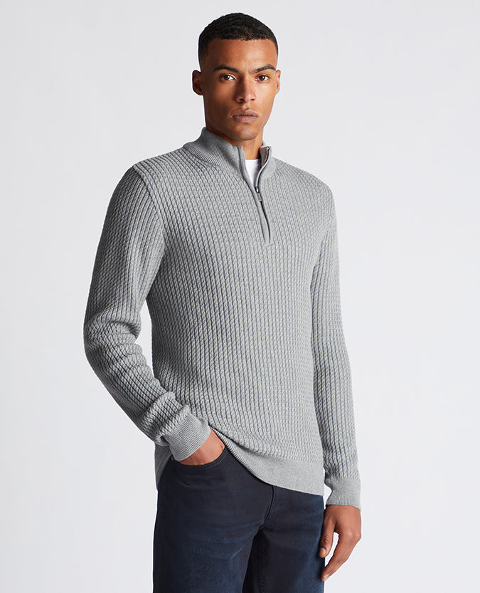 The Remus Uomo Half Zip Sweater is an excellent choice for staying warm without compromising style. Crafted from pure cotton, this half zip sweater features a light grey tapered fit, a medium guage, and an all-over cable knit structure. For a secure fit, the ribbed cuff and hem seal in the warmth.
