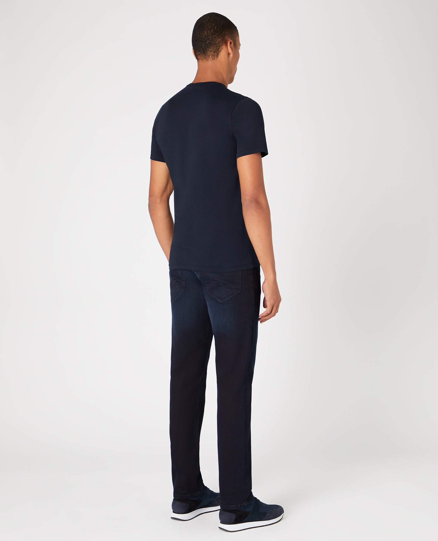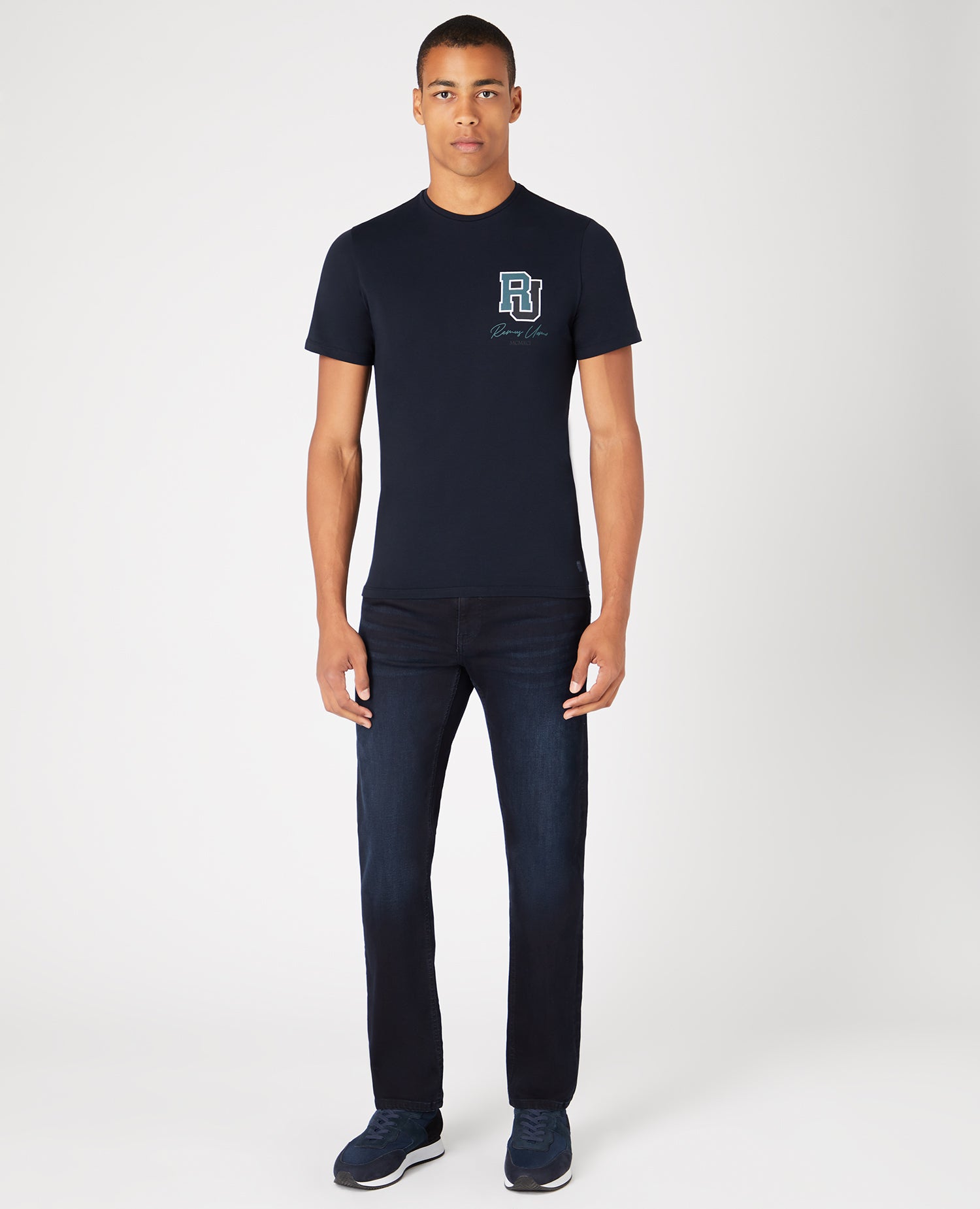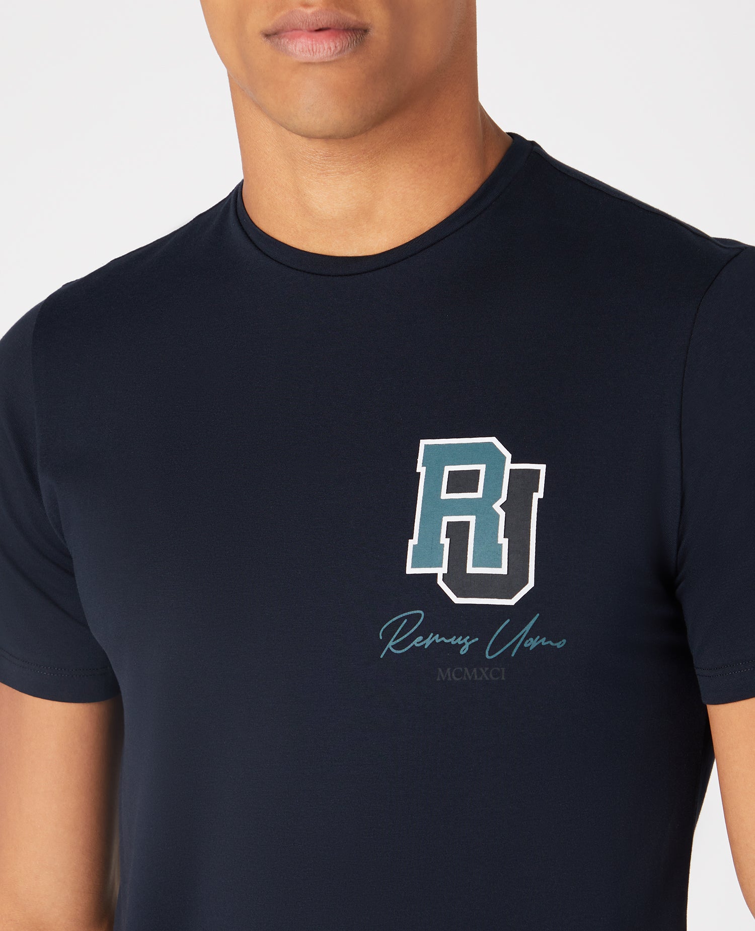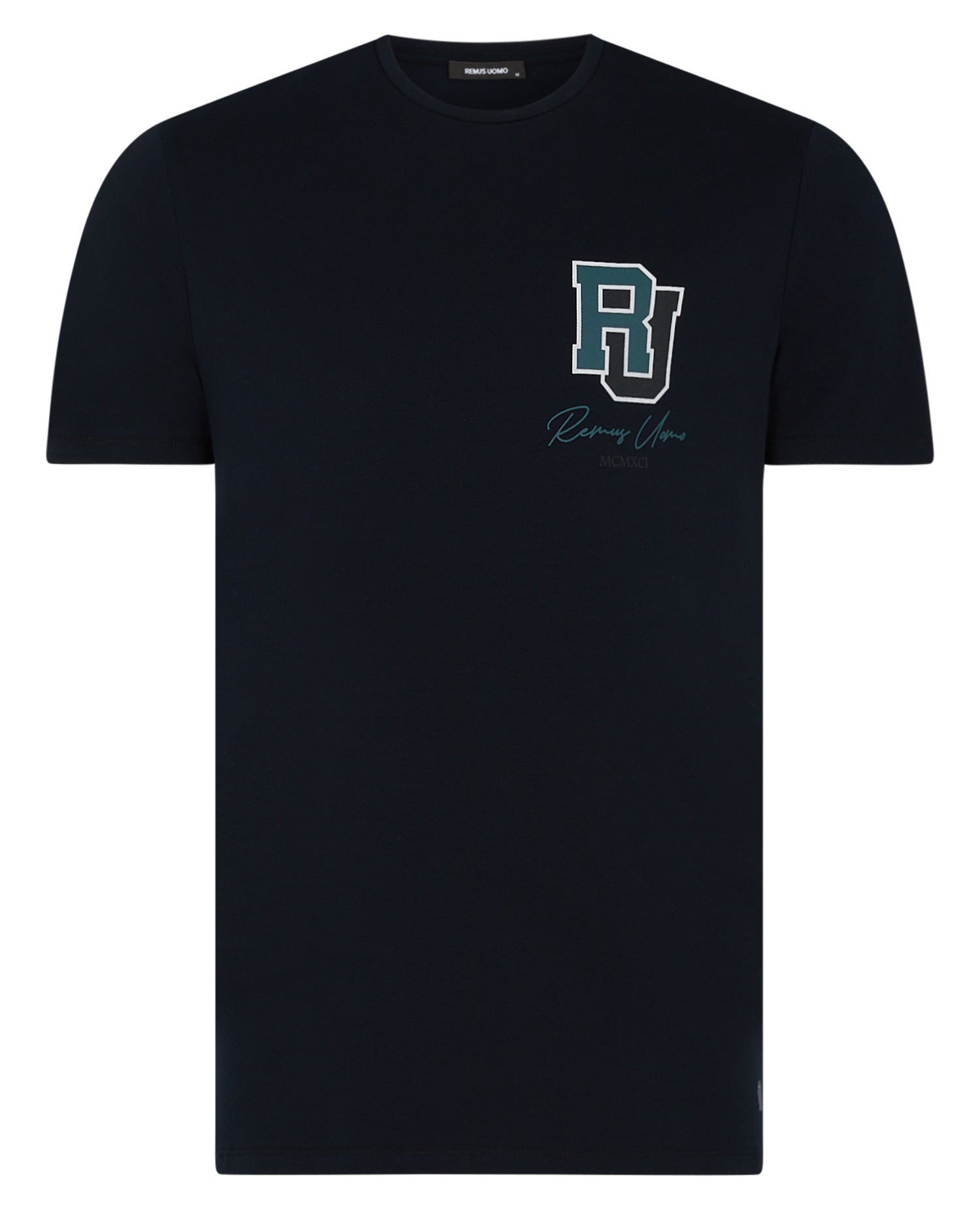 Introducing the Remus Uomo Branded Tee in a classic navy color. Made by Remus Uomo, this t-shirt showcases expert craftsmanship and a timeless design. With its high-quality materials and distinctive branding, this tee is a stylish addition to any wardrobe. Bring a touch of sophistication to your casual look.