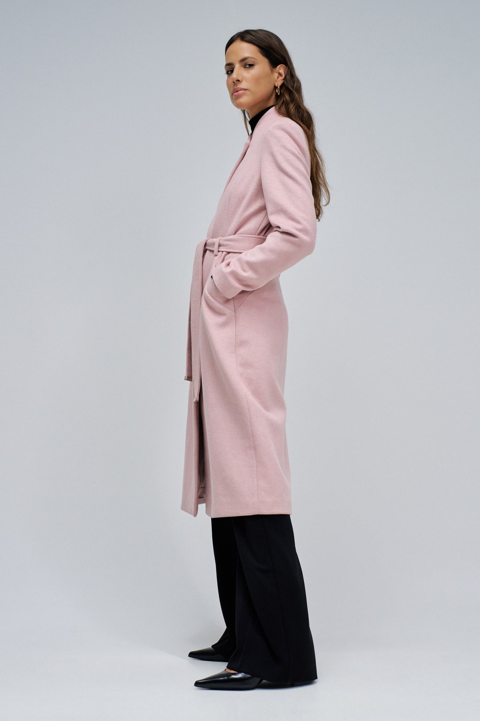 The Salsa Jean Wool Coat in pink is a timeless and elegant choice for autumn and winter. Made from high-quality wool, it features a slim, long fit with long sleeves for warmth and style. Fully lined for comfort, it has a hidden front button opening, side pockets, and buttoned cuffs. The coat comes with an adjustable removable belt detailed with gold accents, allowing you to define your waist as you like. Perfect for both casual and formal occasions, it combines simplicity with sophisticated details.