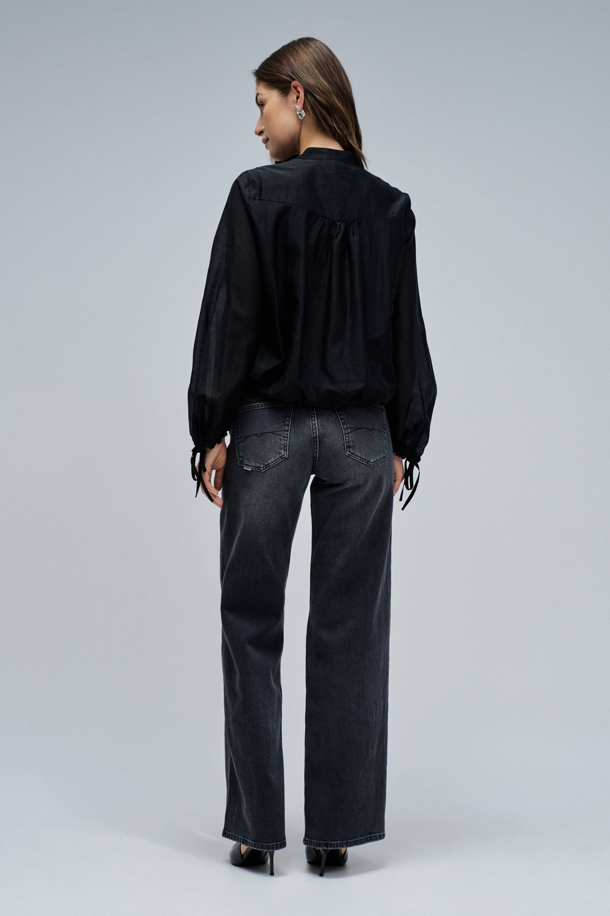 With its fluid texture and light drape, the Salsa Buttoned Cropped Top in black offers comfort and style for long workdays. The perfect neckline pairs with a button front for a relaxed yet polished look. An elastic waist gently defines your silhouette, while puff sleeves tied with bows add a touch of feminine charm. Ideal for effortless transition from summer to the office, this blouse blends elegance with ease, making it a versatile addition to any wardrobe.