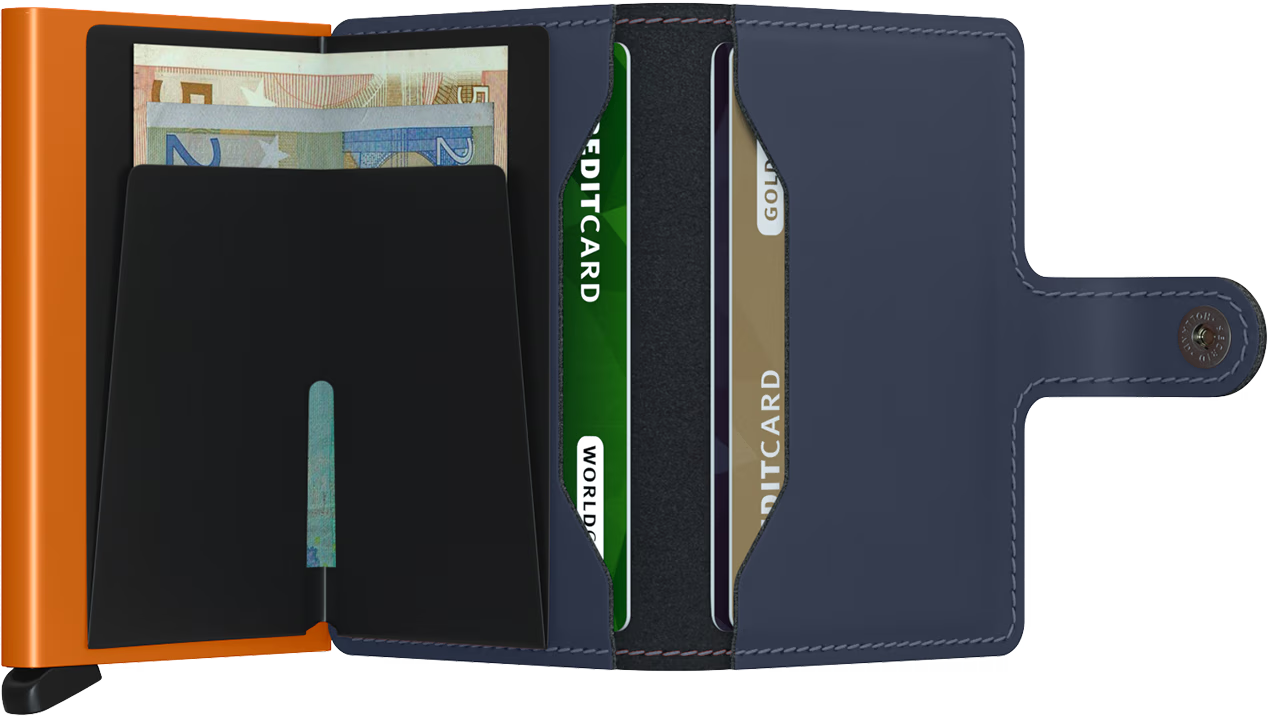 Small yet mighty, the Secrid MiniWallet packs serious storage into a compact design. The sleek matte finish combines night blue and orange for understated style. Inside, the innovative aluminium Cardprotector lets you slide out cards effortlessly while shielding them from damage and wireless interference. Store up to 4 embossed or 6 flat cards, plus 4 more in the exterior wrap, along with banknotes, business cards, and receipts. Smart minimalism for everyday carry.
